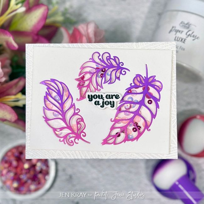 My cards today focus on one die set, Fanciful Feather Dies, and have made two very similar shaker cards.